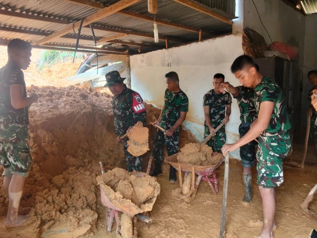 Tapteng-Babinsa Koramil 06/Kota Sibolga Koptu Balut Sigalingging bersama dengan warga sekitar, melaksanakan kegiatan pembersihan di rumah Bapak Henra Supriadi Banjarnahor yang salah satu warga yang terkena dampak bencana alam tanah longsor yang beralamat di Jn.Sudirman Lingkungan IV, Kelurahan Aek Parombunan, Kecamatan Sibolga Selatan, Kamis, (18/12/2025)