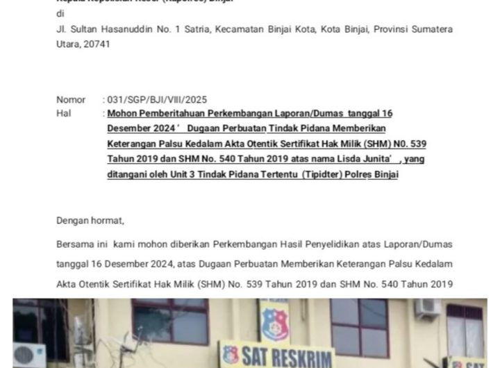 BINJAI ( SUMUT ) – Pengacara Sempurna Ginting,SH dan Yudi Frianto,SH menyurati Kapolres Binjai AKBP Bambamg C.Utomo,SH...