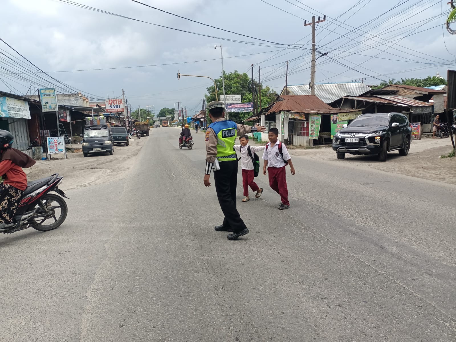 Di Bawah Terik Matahari, Sat Lantas Polres Batu Bara Tetap Semangat Atur Lalu Lintas dan Lindungi Anak Sekolah
