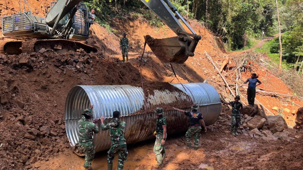 Dalam upaya mempercepat proses pembangunan, personel TNI, aparat desa, dan warga bergotong royong melaksanakan berbagai tahapan pekerjaan. Mereka bekerja sama merakit konstruksi jembatan dan mengganti plat Armco pada bagian ujung jembatan, serta melakukan penimbunan badan jembatan. Untuk mendukung kelancaran pembangunan ini, sejumlah peralatan berat dan manual dikerahkan, termasuk excavator dan perlengkapan konstruksi lainnya, guna memastikan proses pengerjaan berjalan sesuai rencana.