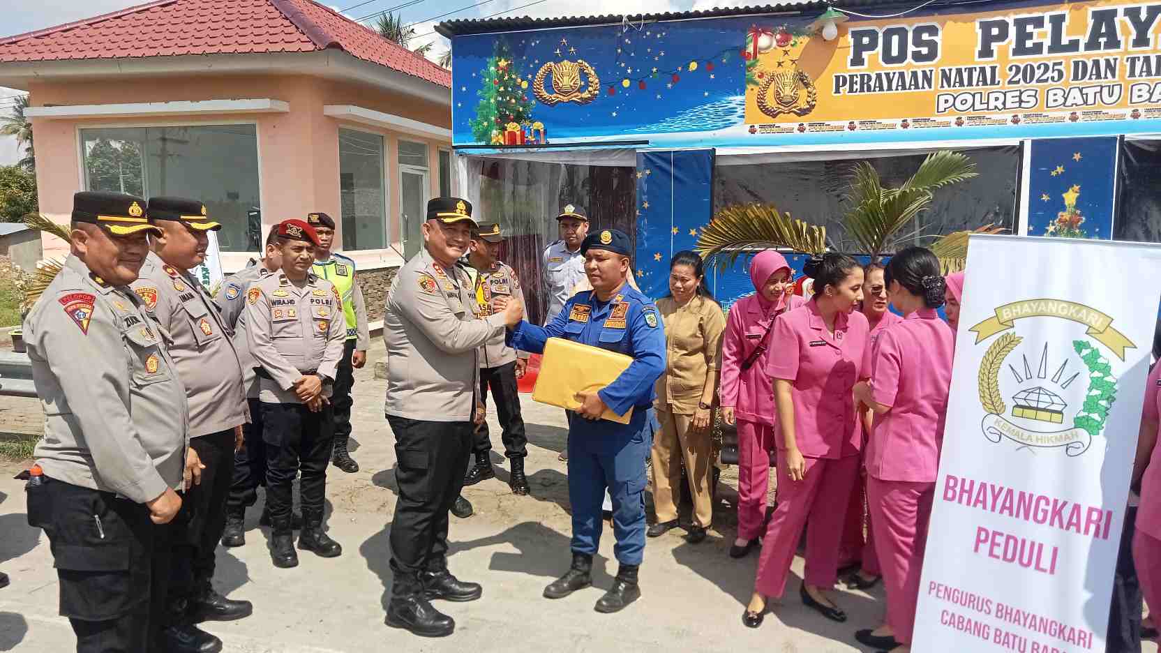 Dalam kegiatan tersebut, Kapolres turut didampingi Ketua Bhayangkari Cabang Polres Batu Bara beserta ibu-ibu Bhayangkari. Selain melakukan pengecekan kesiapan personel dan sarana prasarana, Kapolres juga menyerahkan bingkisan Natal kepada personel yang bertugas sebagai bentuk kepedulian sekaligus motivasi agar tetap semangat dalam menjalankan tugas pengamanan Nataru.
