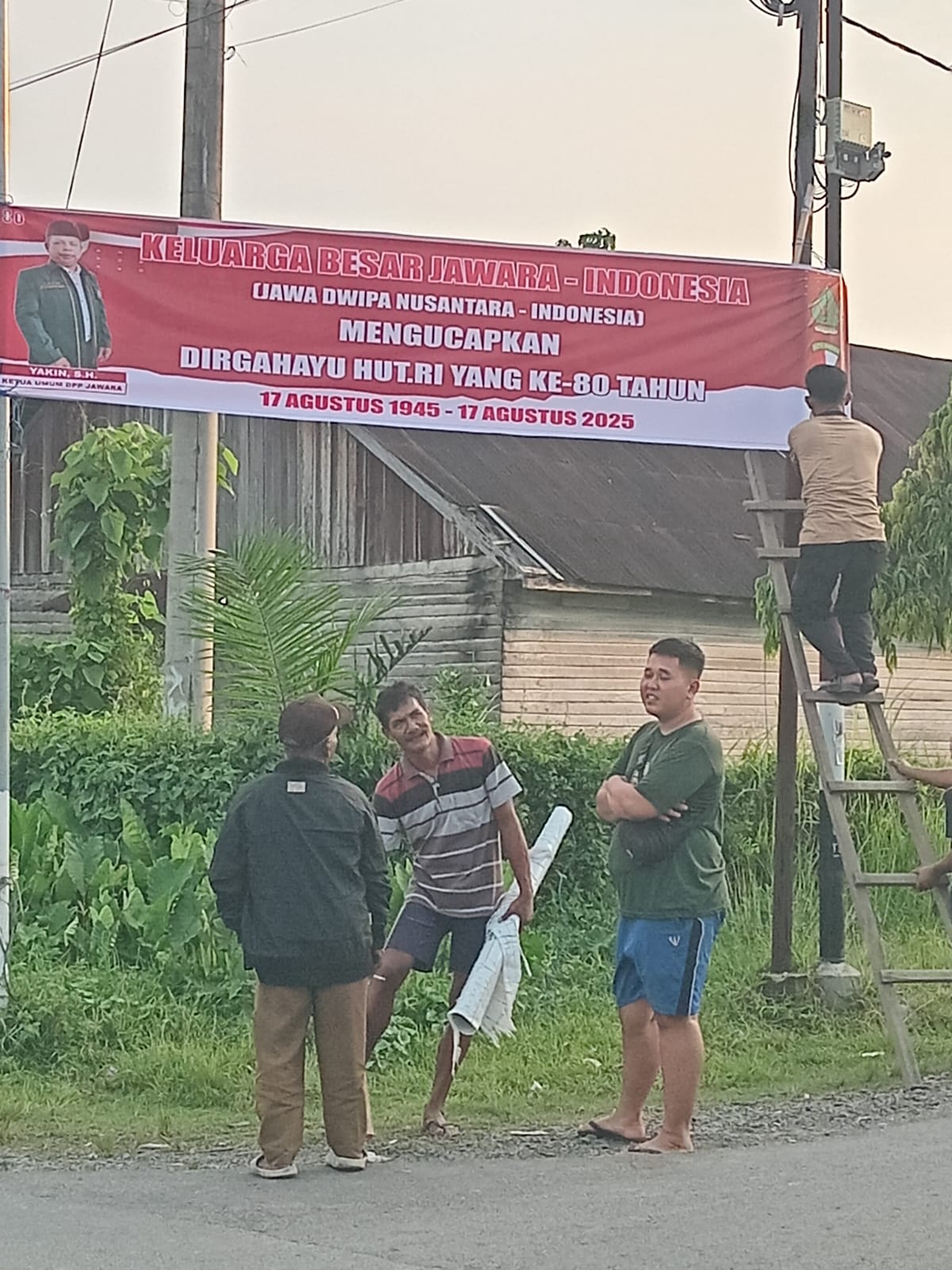Pengurus JAWARA dari tingkat Wilayah,Daerah,Kecamatan Desa dan Dusun. Dengan Penuh Antusias Bersemangat Memasang Atribut Ucapan DIRGAHAYU HUT RI KE 80 tahun.
