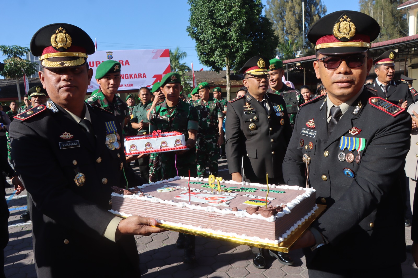 Kue ulang tahun kemudian dipotong bersama dan diserahkan secara simbolis oleh Danyonif 125/SMB Letkol Inf Haris Nur Priatno, S.Sos., Kasdim 0205/TK Mayor CBA Johny Siboro, dan Kajari Karo Darwis Burhansyah, S.H., M.H., sebagai bentuk doa dan harapan agar Polri terus maju dan semakin dicintai masyarakat.
