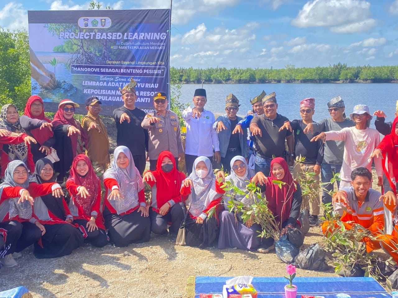 Buser24com. Meranti – Secara berkolaborasi Madrasah Aliyah Negeri 1 Kepulauan Meranti (MAN Sakti), Lembaga Adat Melayu Riau (LAMR), dan Polres Kepulauan Meranti melakukan reboisasi tanaman mangrove di tepian pantai, jalan baru, Desa Sesap, Kecamatan Tebing Tinggi, Selasa (14/10/2025).