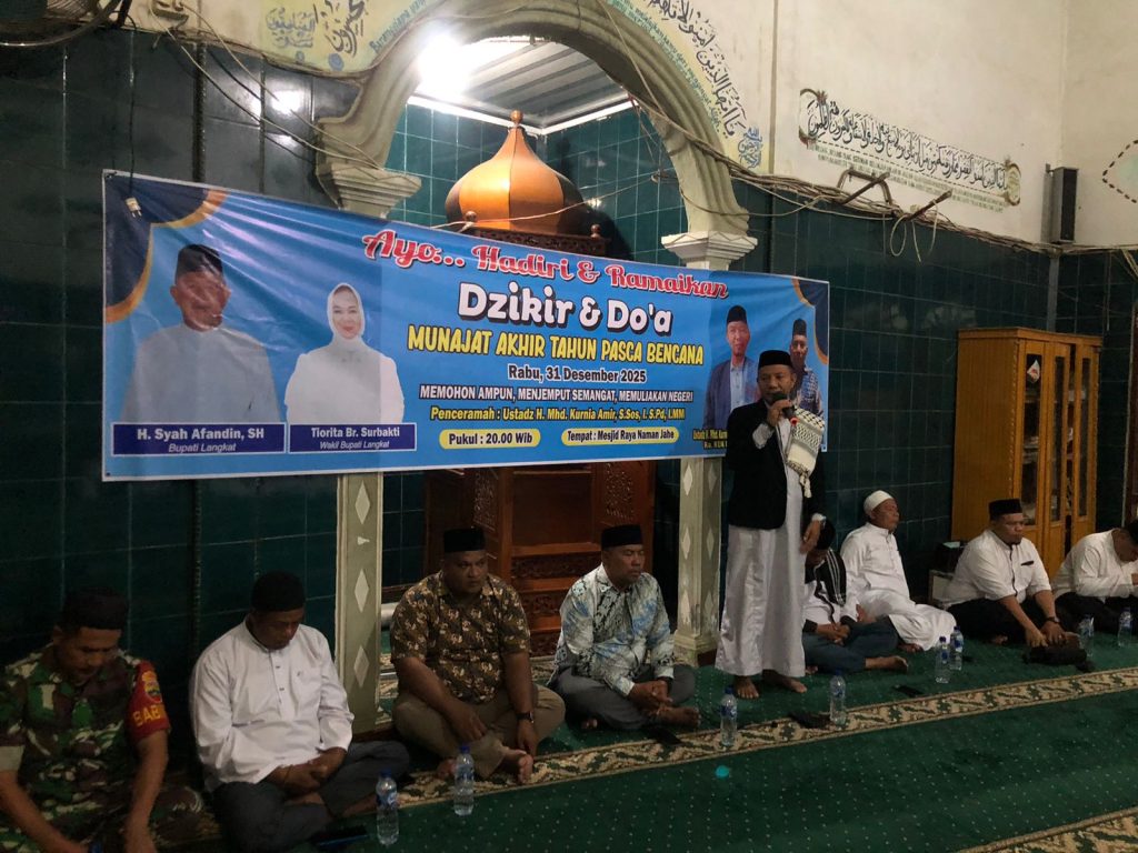 Kepala urusan Agama Kecamatan Salapian H. M. Kurnia Amir, S. Sos. I, S. Pd. I, MM memimpin acara dzikir dan doa munajat akhir tahun pasca bencana yang dilaksanakan dimasjid raya Naman Jahe Kecamatan Salapian Rabu (31/12/25).