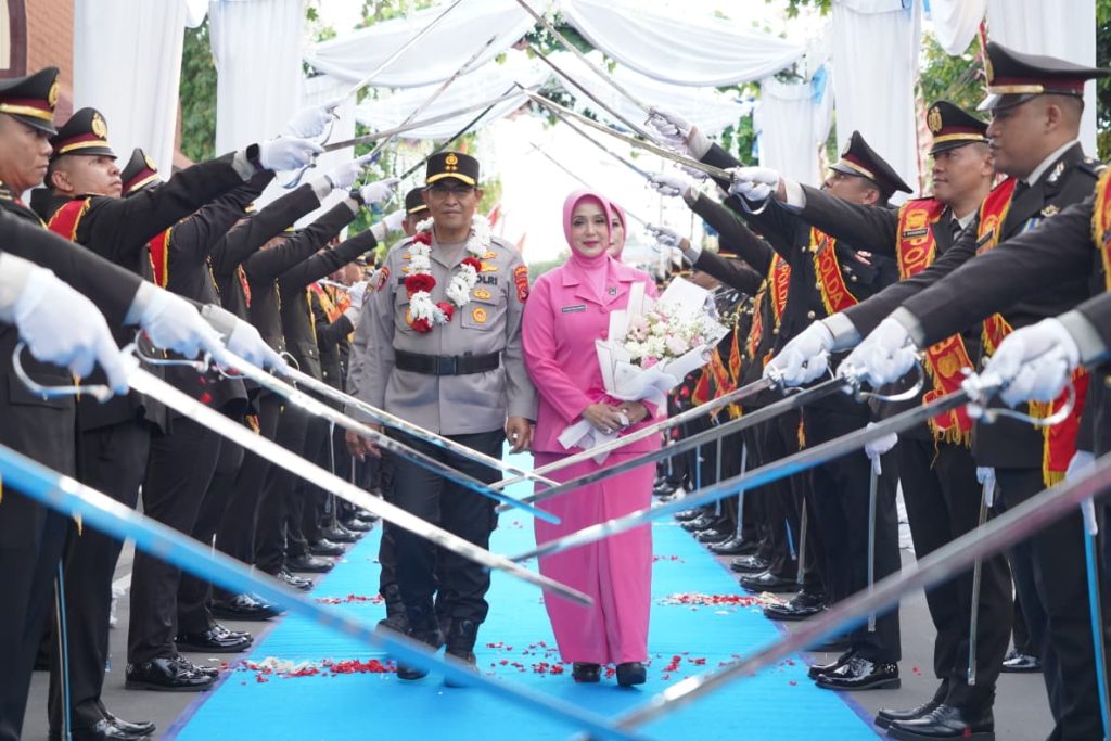 Kapolda NTB Irjen Pol. Edy Murbowo, S.I.K., M.Si. bersama istri berdiri di barisan depan, mengantar langkah terakhir pejabat lama melewati lorong pedang. Personel Polri mengenakan PDL II Kopel Rim tampak berjejer rapi, sementara Bhayangkari hadir anggun dengan busana seragam harian (PSH).