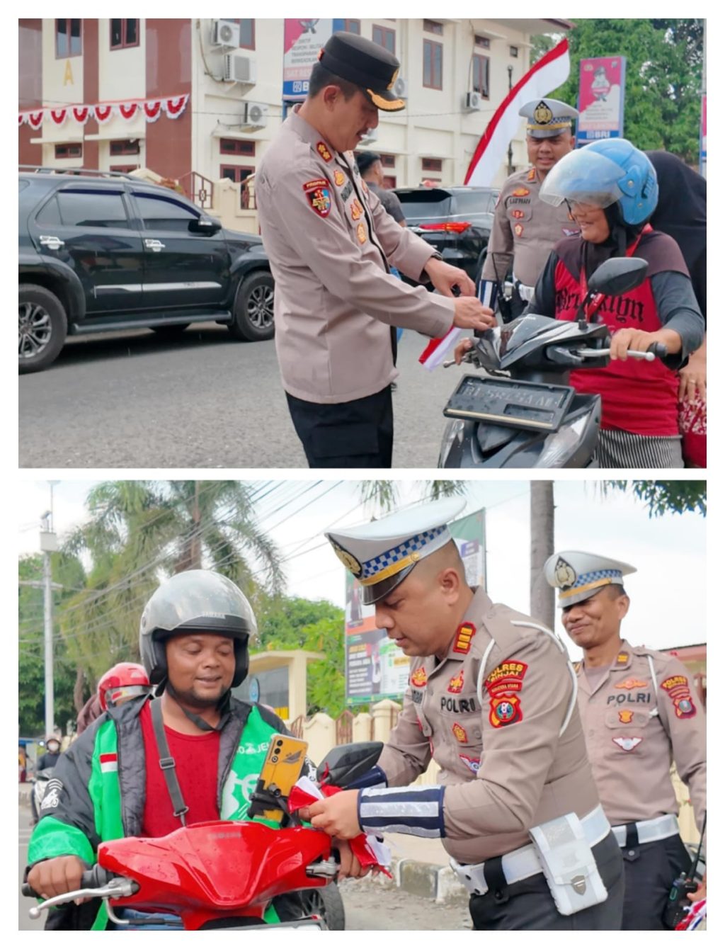 Dalam rangka menyambut hari Kemerdekaan Republik Indonesia yang ke-80 tahun 2025, kita bagikan bendera merah putih kepada masyarakat pengguna jalan dengan tujuan untuk memeriahkan hari kemerdekaan, menumbuhkan semangat masyarakat akan cinta tanah air, bangga sebagai bangsa Indonesia serta menjadi bagian dalam mengisi kemerdekaan itu dengan hal-hal positif demi kemajuan bangsa dan negara, ujar Kapolres.( Foto : Kapolres Binjai AKBP Bambang C.Utomo,SH,SIK,M.Si didampingi Kasat Lantas AKP Syamsul A.Batubara,SH,MH memberikan bendera Merah Putih kepada pengguna jalan umum.)