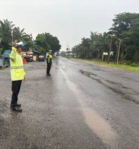 Dibawah kepemimpinan Kasat Lantas Polres Batu Bara AKP Simon Elika Simatupang, S.H., M.H., personel tetap bersemangat menjaga kelancaran dan keselamatan pengguna jalan meski diguyur hujan deras.