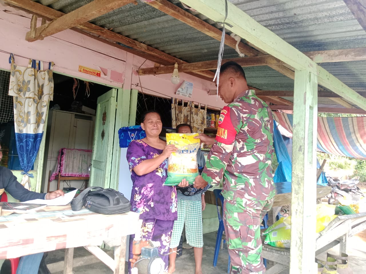 Tapteng -Babinsa Koramil 01/Barus Serda Abdul Halim Purba, membantu warga dalam menyalurankan beras murah dari bulog untuk warga di desa Lobu Tua,kecamatan Andam Dewi, Jumat 29/Agustus/2025