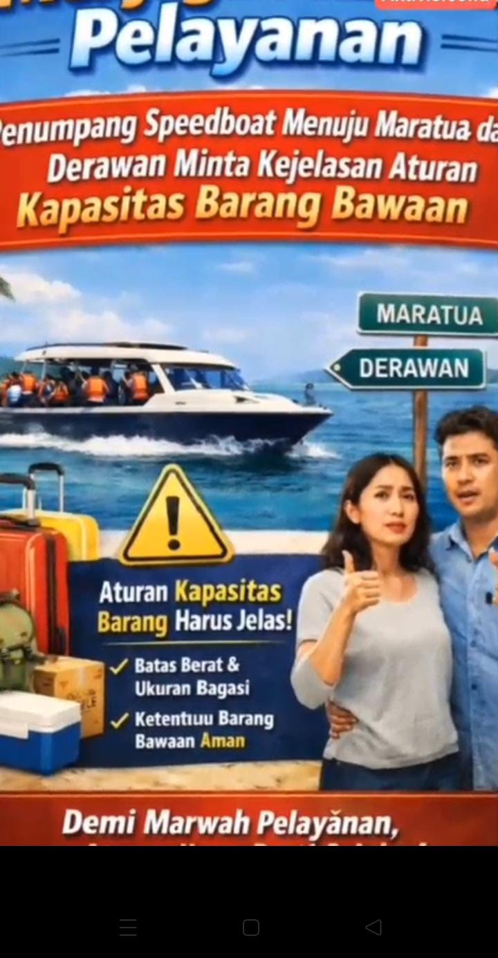 Berau, Kaltim — Menjelang libur Hari Raya Idul Fitri 2026, pelayanan transportasi laut rute Tanjung Redeb menuju Pulau Maratua dan Kepulauan Derawan kembali menjadi perhatian para penumpang, khususnya terkait kejelasan aturan kapasitas barang bawaan di speedboat.