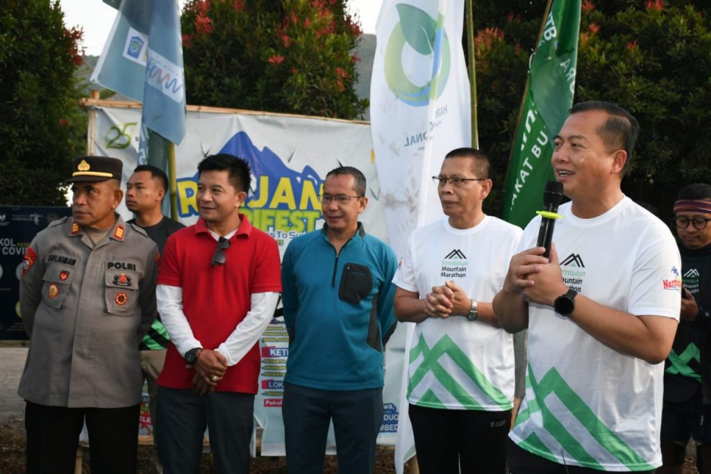 Sebelum melepas para peserta, Gubernur menyapa para pelari dan memberikan semangat agar mereka menikmati lintasan yang menantang dengan aman dan sportif.