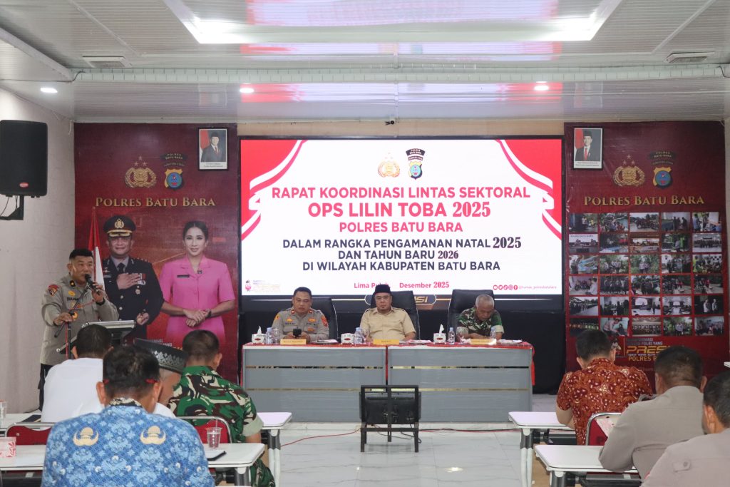 Batu Bara,Buser24.com — Polres Batu Bara menggelar Rapat Koordinasi Lintas Sektoral Operasi Kepolisian Terpusat Lilin Toba 2025 dalam rangka pengamanan dan pelayanan perayaan Natal 2025 dan Tahun Baru 2026 di wilayah Kabupaten Batu Bara. Kegiatan berlangsung di Aula Sarja Arya Racana Polres Batu Bara, Jumat (19/12/2025) sore.