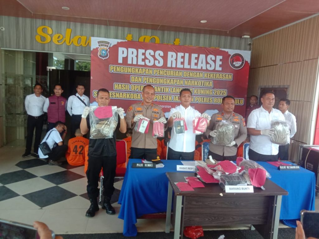 Rokan Hulu,Buser24.com – Polres Rokan Hulu menggelar kegiatan press release terkait pengungkapan kasus pencurian dengan kekerasan dan narkotika, hasil Operasi Antik Lancang Kuning Tahun 2025, Senin (13/10/2025) pukul 14.00 WIB di lobi Mapolres Rokan Hulu.
