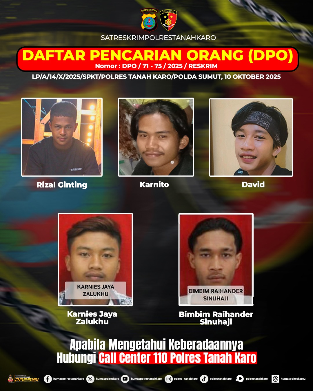 Satuan Reserse Kriminal (Satreskrim) Polres Tanah Karo resmi menerbitkan Daftar Pencarian Orang (DPO) terhadap lima terduga pelaku tindak pidana. Penerbitan DPO tersebut tercantum dalam Nomor: DPO/71–75/2025/RESKRIM, berdasarkan LP/A/14/X/2025/SPKT/POLRES TANAH KARO/POLDA SUMUT yang dikeluarkan pada 10 Oktober 2025.
