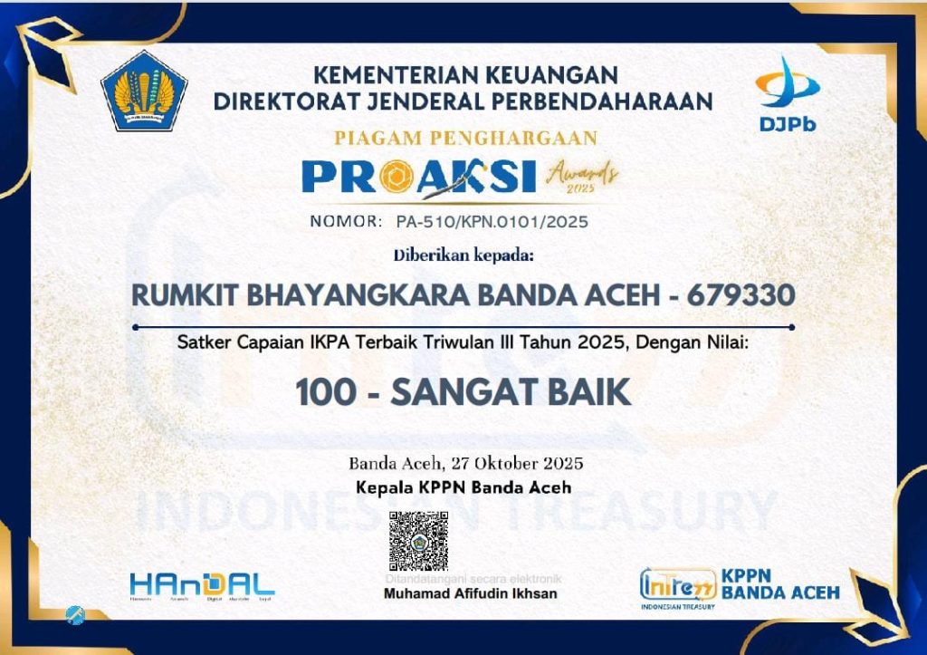 Rumah Sakit (Rumkit) Bhayangkara Tingkat III Polda Aceh kembali menorehkan prestasi membanggakan dengan meraih tiga penghargaan sekaligus, yaitu Penghargaan Proaksi Triwulan III Tahun 2025 dari KPPN Banda Aceh, Penghargaan Maturity Rating Terbaik dari Kanwil Direktorat Jenderal Perbendaharaan (DJPb) Provinsi Aceh, dan Satker Capaian IKPA Terbaik 100% Triwulan III Tahun 2025.