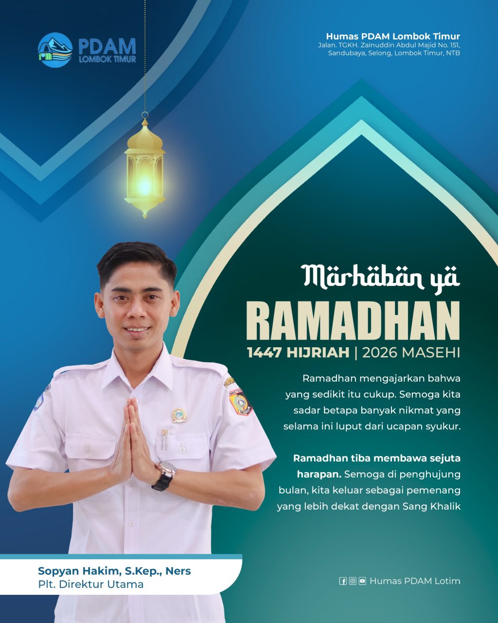 BUSER24.COM, Lombok Timur (NTB)-Menyambut datangnya Bulan Suci Ramadhan 1447 Hijriah/2026 Masehi, Plt Direktur Utama PDAM Lombok Timur, Sopyan Hakim, S.Kep., Ners, menyampaikan ucapan Marhaban Ya Ramadhan kepada seluruh masyarakat, khususnya pelanggan PDAM Lombok Timur. Ia mengajak umat Muslim menjadikan Ramadhan sebagai momentum memperkuat iman dan memperdalam rasa syukur.