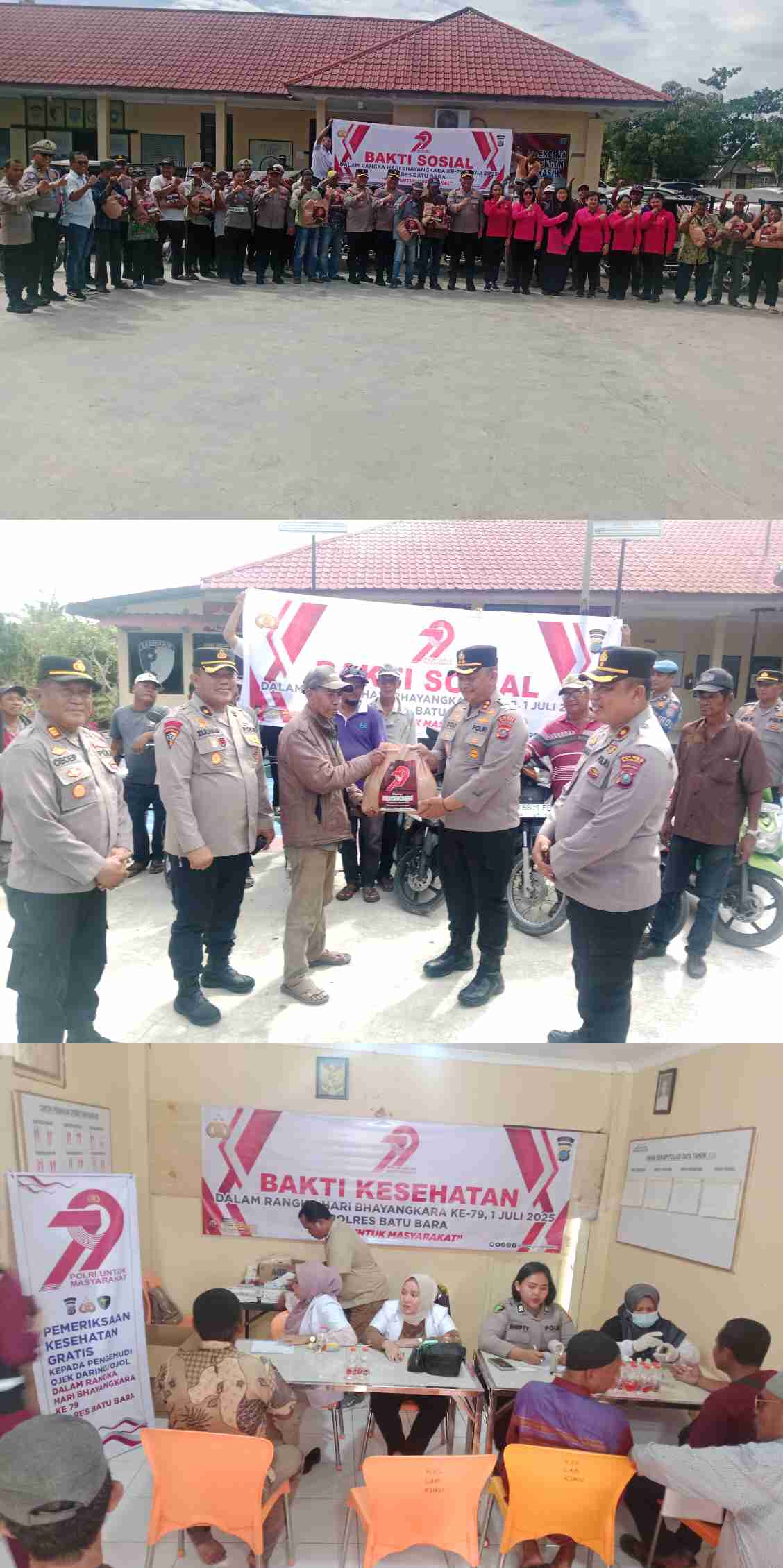 Batu Bara,Buser24.com – Dalam rangka menyambut Hari Ulang Tahun Bhayangkara ke-79, Kapolres Batu Bara AKBP Doly Nelson Nainggolan SH, MH didampingi PJU Polres Batu Bara dan Kapolsek Labuhan Ruku AKP Cecep Suhendra, menggelar kegiatan Baktikes atau Pengecekan Kesehatan secara GRATIS dan bakti sosial dengan membagikan bantuan sosial (bansos) sembako kepada abang Tukang becak dan abang Betor (RBT) sebanyak 30 Paket sembako, yang diselenggarakan di Mapolsek Labuhan Ruku, Selasa (17/6/2025).