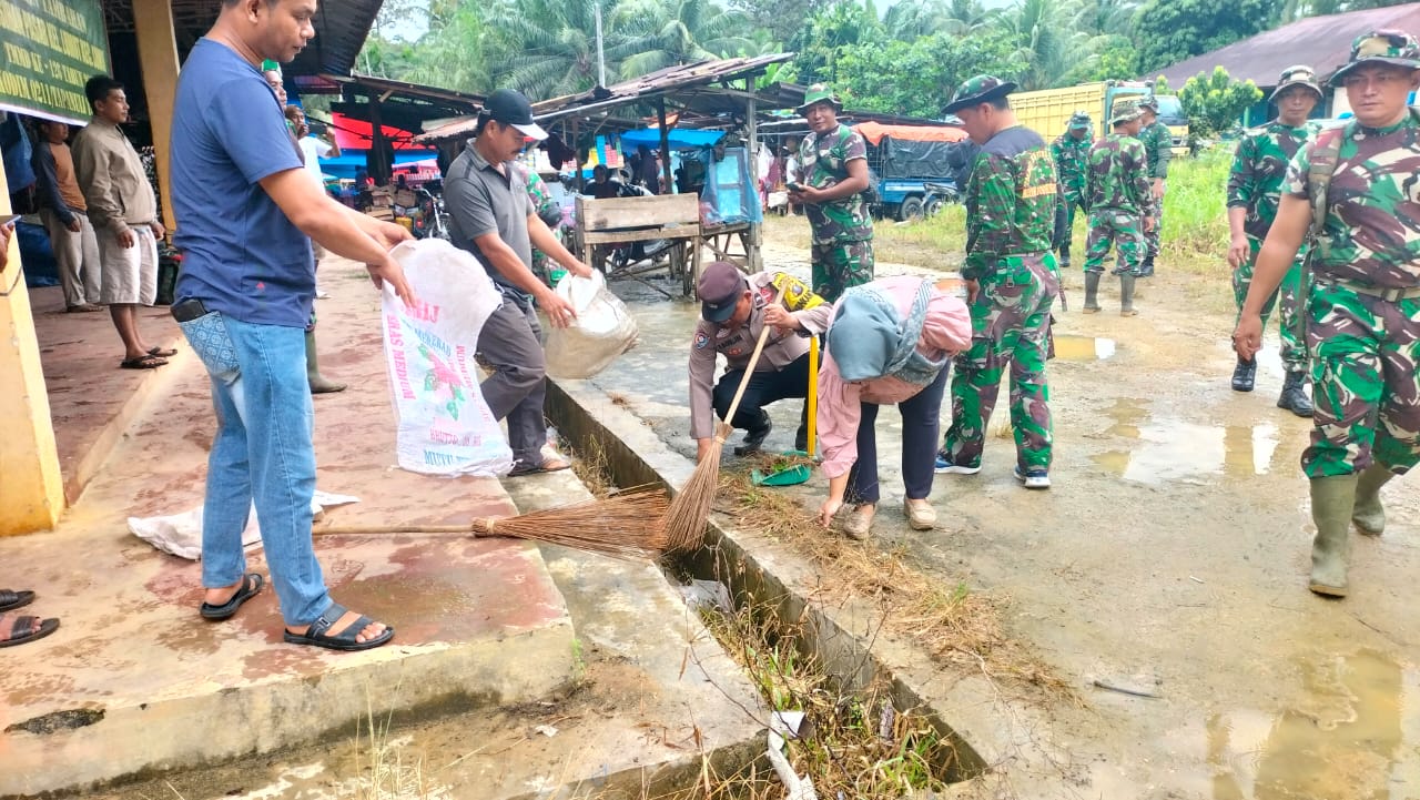 Personel TNI- POLRI,ORMAS dan masyarakat yang tergabung dalam Satuan Tugas (Satgas) TMMD 126 Kodim 0211/TT bersama warga sekitar, melaksanakan kegiatan bersih-bersih di area Pasar Tradisional desa Lumut Kecamatan Lumut Minggu (12/10/2025).