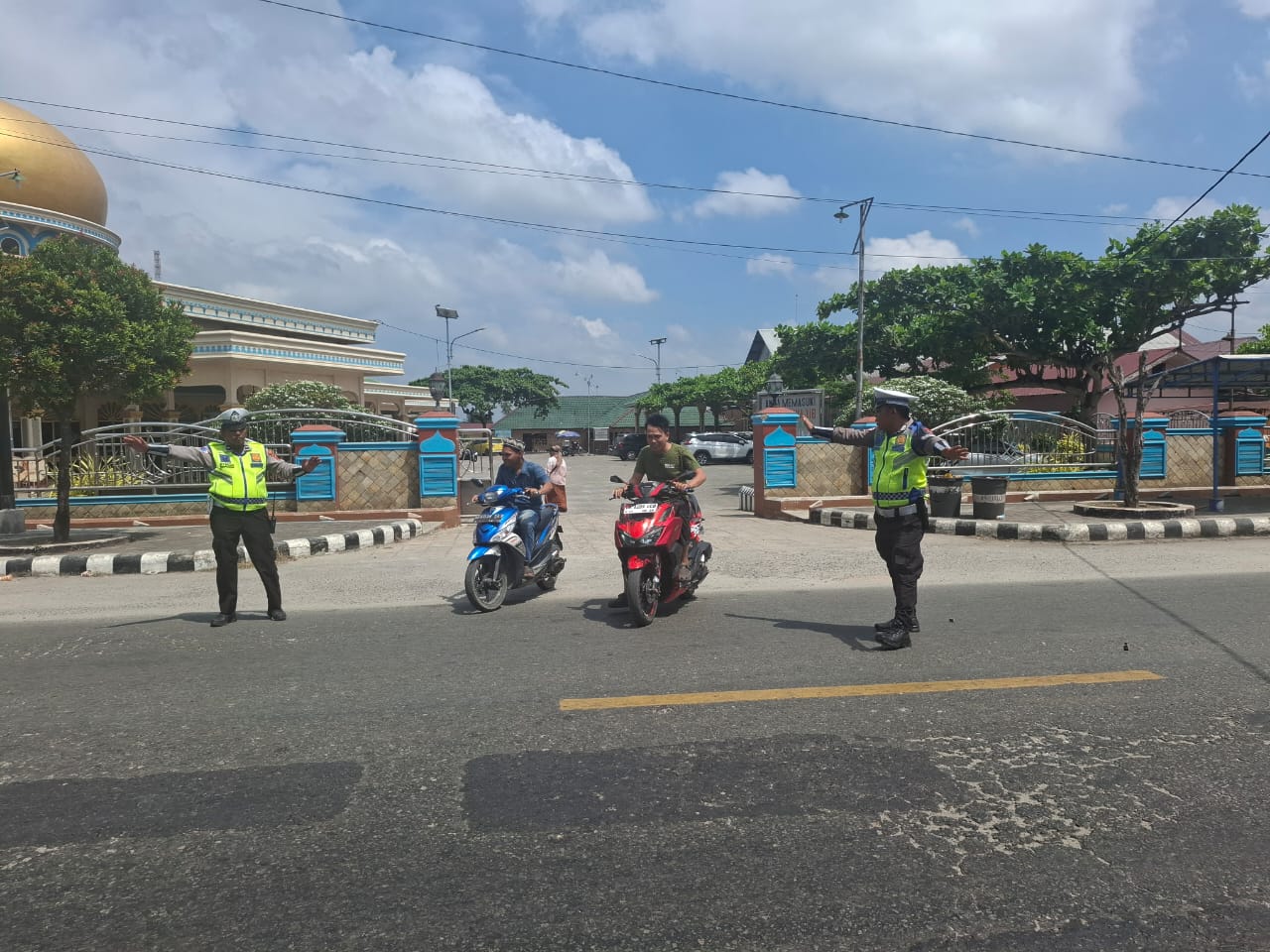 Dalam pelaksanaannya, petugas melakukan pengaturan arus kendaraan di depan dan sekitar area masjid, membantu masyarakat yang hendak menyeberang jalan, serta memberikan imbauan kepada para pengendara untuk memarkirkan kendaraan dengan tertib.