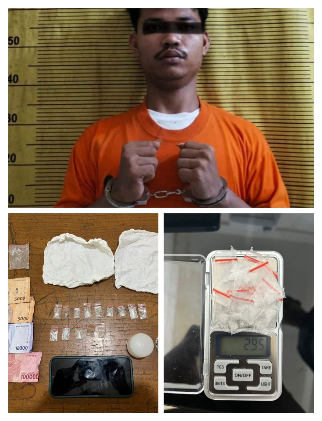 Saat itu juga petugas langsung melakukan interogasi terhadap pemuda yang mengaku bernama AP (22) yang tinggal di jalan MT. Haryono kecamatan utara.Ketika ditanya kenapa lari serta membuang bola lampu yang dipegangnya, kemudian AP mengakui bola lampu itu miliknya dan digunakan sebagai tempat penyimpanan narkoba jenis sabu-sabu. Kemudian petugas menyuruh AP untuk mengambil dan membuka bola lampu sehingga ditemukan didalamnya berupa, 14 (empat belas) paket narkotika jenis Sabu dibungkus plastik klip transparan dengan berat brutto 2,95 gram, 2 (dua) bungkus plastik klip transparan kosong, 2 (dua) lembar tisu warna putih, 1 (satu) unit hp merk Oppo warna putih, uang tunai senilai Rp.120.000,- (diduga uang hasil penjualan) serta 1 (satu) bola lampu warna putih (tempat penyimpanan narkotika).