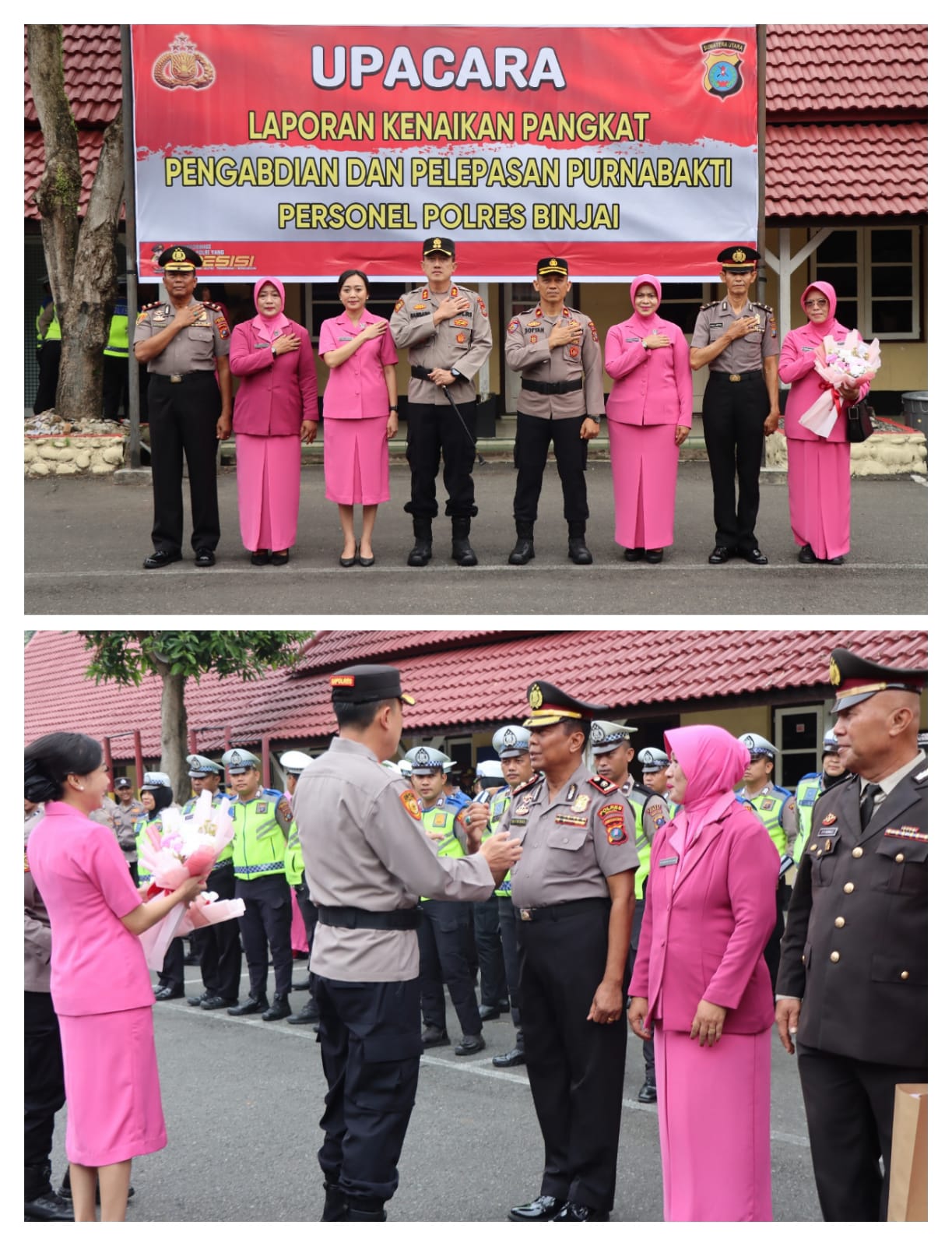 Upacara kenaikan pangkat pengabdian dan pelepasan terhadap personil yang memasuki masa Purnabakti ini juga dihadiri oleh Ketua Bhayangkari Ny. Arina Bambang, Waka Polres Kompol Sofyan H. Nst., S.H., M.H., para Pejabat Utama dan personil Polres Binjai serta bhayangkari cabang Binjai.