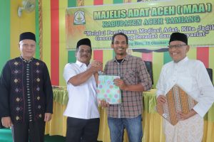 Seusainya dalam menyampaikan kata sambuatan, Wabup Aceh Tamiang Ismail, SE., yang didampingi oleh Ketua Majelis Adat Aceh (MAA) Memberikan Cindera Mata atau Rewards kepada salah satu MDSK Kampung Sukajadi Paya Bujok sebagai Apresiasi Pembuatan Rancangan Qanun atau resam kampung.